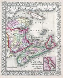 | Keywords: 1866 Mitchell Map of New Brunswick and Nova Scotia, Canada - Geographicus - NewBrunswickNovaScotia-mitchell-1866.jpg A beautiful example of S A Mitchell Jr ™s 1864 map of the Canadian Maritime Provinces of Nova Scotia New Brunswick Prince Edward ™s Island and Cape Breton Island Detailed to the county level with special attention both political and geographic elements Notes important river systems railways canals and cities An inset map in the lower right quadrant depicts the city and harbor of Halifax One of the most attractive American atlas maps of this region to appear in the mid 19th century Features the vine motif border typical of Mitchell maps from the 1866-79 period Prepared by S A Mitchell for inclusion as plate no 5 in the 1865 issue of Mitchell ™s New General Atlas Dated and copyrighted Entered according to Act of Congress in the Year 1865 by S Augustus Mitchell in the Clerk ™s Office of the District Court of the U S for the Eastern District of Pennsylvania 1866 dated Size in 11 14 object history credit line accession number NewBrunswickNovaScotia-mitchell-1866 <i>Mitchell's new general atlas containing maps of the various countries of the World plans of cities etc </i> 1866 edition Geographicus-source PD-old-100 Maps by Samuel Augustus Mitchell Old maps of Nova Scotia Old maps of New Brunswick Old maps of Prince Edward Island 1866 maps of Canada |