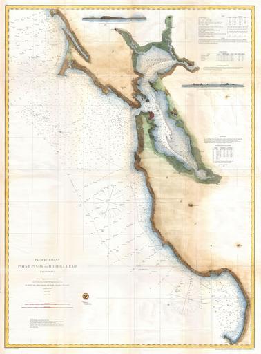 | Keywords: 1866 U.S. Coast Survey Chart or Map of San Francisco Bay - Geographicus - SanFranciscoBay-uscs-1866.jpg An extraordinary 1866 U S Coast Survey nautical chart or map of the San Francisco Bay Covers from Point Pinot north was far as Bodega Head Includes all of the San Francisco Bay with river systems documented as far north as Napa and Petaluma This is one of the rarest and most desirable charts issued by the U S Coast Survey as it is the first chart to depict the continental shelf break for a significant portion of the west coast It also provides a stunning overview of this region shortly following the California Gold Rush Includes the cities of San Francisco Oakland Napa Petaluma Brooklyn Union City Vallejo Redwood City Alviso Monterrey Santa Cruz and others Identifies Mt Bache Black Mountain Montana Mountain Mount Diablo and Table Mountain While this map offers only minimal inland detail the maritime detail is extraordinary Offers thousands of depth sounding throughout and identifies various important bays sounds islands shoals other undersea dangers lighthouses beacons rivers etc Notes on lighthouses tides soundings and magnetic variation appear in the upper right quadrant The triangulation for this chart was completed by R D Cutts G A Fairfield G Davidson A F Rodgers and W E Greenwell The topography was exceuted by R D Cutts A F Rodners A M Harrison J S Lawson and W M Johnson The hydrography is the work of Commander James Alden Commander R M Cuyler Commander B F Sands A F Rodgers E Cordell and others This chart was prepared under the supervision of A D Bache one of the most influential Superintendents in the history of the Coast Survey Issued in the 1867 supplement to the 1865 Superintendent's Report 1866 dated Size in 29 39 object history credit line accession number SanFranciscoBay-uscs-1866 <i>Report of the Superintendant of the United States Coast Survey </i> Washington 1867 Supplement to the 1865 edition Geographicus-source PD-art United States Coast Survey maps Old maps of San Francisco Bay 1866 maps |