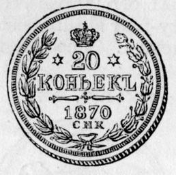 | Keywords: 1870 Russian 20 kopecks obverse.png A Russian silver 20 kopeck piece of 1870 Weight 11 2 fineness 875 Value 57 3/4d Obverse shown Engraving from the article Recent Coinage of the World in the Companion to the British Almanac of 1874 1874 Name of coin designer or engraver not known PD-old Coins of the Russian Empire 1870 coins |