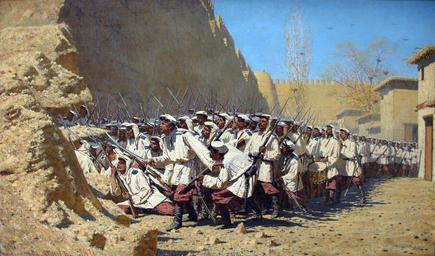 | Keywords: 1871 Vereshchagin In der Stadtmauer anagoria.JPG Artwork Creator Vasily Vereshchagin en At the city wall Let them enter de In der Stadtmauer Lasst sie kommen Painting commemorating the capture of Khiva by Russian Imperial troops 1871 oil canvas cm 95 160 5 Russian Museum object history credit line accession number Tretyakov Gallery PD-old-100 Paintings by Vasily Vereshchagin At the city wall 19th-century paintings in the Russian Museum Russian imperialist wars of conquest in Turkestan Khanate of Khiva Khiva Russian history paintings 1871 oil on canvas paintings Soldiers of Russia in art People with firearms in art 1871 orientalist paintings Bayonets in art Soldiers of Russia Military drummers in art Military of the Russian Empire by Vasily Vereshchagin 1870s paintings in Russia |
