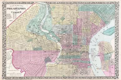 | Keywords: 1876 Mitchell Map of Philadelphia, Pennsylvania - Geographicus - Philadelphia-mitchell-1876.jpg A beautiful example of S A Mitchell Jr ™s 1876 folio map of Philadelphia Pennsylvania Covers downtown Philadelphia and adjacent Camden offering street detail on both sides of the Delaware and Schuylkill Rivers Names important buildings parks roads railways public work and military installations Color coded according to city wards Surrounded by the attractive vine motif border common to Mitchell atlases between 1866 and 1880 One of the more attractive atlas maps of Philadelphia to appear in the later 19th century Prepared by S A Mitchell Jr for inclusion as plates 42-43 in the 1876 issue of Mitchell ™s New General Atlas Dated and copyrighted Entered according to Act of Congress in the Year 1876 by S Augustus Mitchell in the Office of the Librarian of Congress in Washington 1876 dated Size in 22 15 object history credit line accession number Philadelphia-mitchell-1876 Mitchell Jr S A <i>Mitchell's New General Atlas</i> 1876 edition Geographicus-source PD-old-100 Maps by Samuel Augustus Mitchell Old maps of Philadelphia 1876 maps Philadelphia Wilmington and Baltimore Railroad |