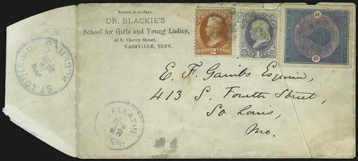 | Keywords: 1877 Buffalo balloon cover.png en Cover flown on June 18 1877 Buffalo balloon flight from Nashville to Gallatin Tennessee One of three covers recorded 5-cent Buffalo balloon airmail label affixed with additional 3-cents of postage stamps to pay for delivery to final destination; St Louis MO <br>Hammer price realised was US 415 000 author http //www robertasiegelauctiongalleries org/2004/874/58 jpg Image file page was sourced from http //www robertasiegelauctiongalleries org/2004/874/y8748 htm Robert A Siegel Auction Galleries auction of The Jeanette C Rudy Collection of Tennessee Postal History auction Tuesday April 27 2004 1877 PD-old 1877 stamps Airmail covers Transport of post by aircraft Philatelic uploads by Ww2censor United States Gallatin Tennessee 1877 postmarks |