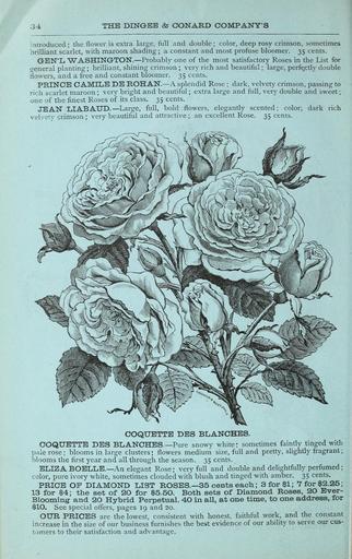 | Keywords: 1884 the new guide to rose culture (16782637827).jpg 34 <br> THE DINGEE OONARD COMPANY'S <br> ititToduced; the flower is extra large full and double; color deep rosy crimson sometimes <br> brilliant scarlet with maroon shading ; a constant and most profuse bloomer 35 cents <br> GrEN'L WASHING-TON Probably one of the most satisfactory Roses in the List for <br> general planting ; brilliant shining crimson ; very rich and beautiful ; large perfe ctly double <br> flowers and a free and constant bloomer 35 cents <br> PRINCE CAMILE DE ROHAN A splendid Rose ; dark velvety crimson passing to <br> rich scarlet maroon ; very bright and beautiful ; extra large and full very double and sweet ; <br> one of the finest Roses of its class 35 cents <br> JEAN LIABAUD Large full bold flowers elegantly scented ; color dark rich <br> velvety crimson; very beautiful and attractive ; an excellent Rose 35 cents <br> COQUETTE DES BLANCHES <br> COQUETTE DES BLANCHES Pure snowy w hite sometimes faintly tinged with <br> pale rose ; blooms in large clusters ; flowers medium size full and prett ' slightly fragrant ; <br> blooms the first year and all through the season 35 cents <br> ELIZA BOELLE An elegant Rose ; very full and double and delightfully perfumed ; <br> color pure ivory white sometimes clouded with blush and tinged with amber 35 cents <br> PRICE OF DIAMOND LIST ROSES 35 cents eacb ; 3for l; 7 for 2 25; <br> 13 for 4; the set of 20 for 5 50 Both sets of Diamond Roses 20 Ever- <br> Blooming and 20 Hybrid Perpetual 40 in all at one time to one address for <br> 10 See special offers pages 19 and 20 <br> OUR PRICES are the lowest consistent with honest faithful work and the constant <br> increase in the size of our business furnishes the best evidence of our ability to serve our cus- <br> tomers to their satisfaction and advantage 43875980 149649 78306 Page 34 Text http //www biodiversitylibrary org/page/43875980 1884 10 5962/bhl title 78306 Dingee Conard Co ; Henry G Gilbert Nursery and Seed Trade Catalog Collection Biodiversity Heritage Library 1884 the new guide to rose culture Catalogs Dingee Conard Co Flowers Nurseries Horticulture Nursery stock Roses Trade catalogs U S Department of Agriculture National Agricultural Library bhl page 43875980 dc identifier http //biodiversitylibrary org/page/43875980 bhlGardenStories Coquette des Blanches rose dingee conard co nurseries horticulture u s department of agriculture national agricultural library bhlgardenstories coquette des blanches rose Information field Flickr posted date ISOdate 2015-03-31 CC-BY-2 0 BioDivLibrary https //flickr com/photos/61021753 N02/16782637827 2015-08-23 22 03 59 cc-by-2 0 PD-old-70-1923 1884 the new guide to rose culture Photos uploaded from Flickr by FĂŚ using a script |