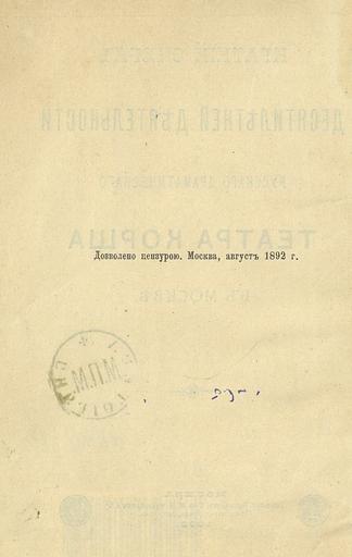 Краткий очерк десятилетней деятельности русского драматического театра Корша в Москве / [Ф.А. Корш]. - Москва : типо-лит. т-ва И.Н. Кушнерев и К°, 1892. - 50 с., 1 л. ил.; 19.
