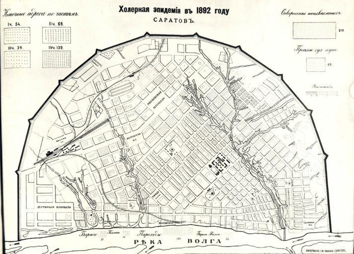 | Keywords: План Саратова 1892 года.jpg  Са атов План го ода 1892 года с нанесёнными данными по эпидемии холе ы в 1892 году Contemporary map of the 1892 cholera outbreak in the city of Saratov Russia Individual cases when properly localized are marked as dots in each block Individual cases with unknown or uncertain localization and out-of-town patients who traveled by land are shown and counted in the squares in upper right and upper left Dotted areas in the bottom are for cases that occured on the Volga river ships barges etc скан с книги изданной до 1917 года before 1917 года Author PD-old Maps of Saratov Old maps of cities of the Russian Empire History of Saratov 19th-century fortress plans Cholera maps 1892 in Russia |