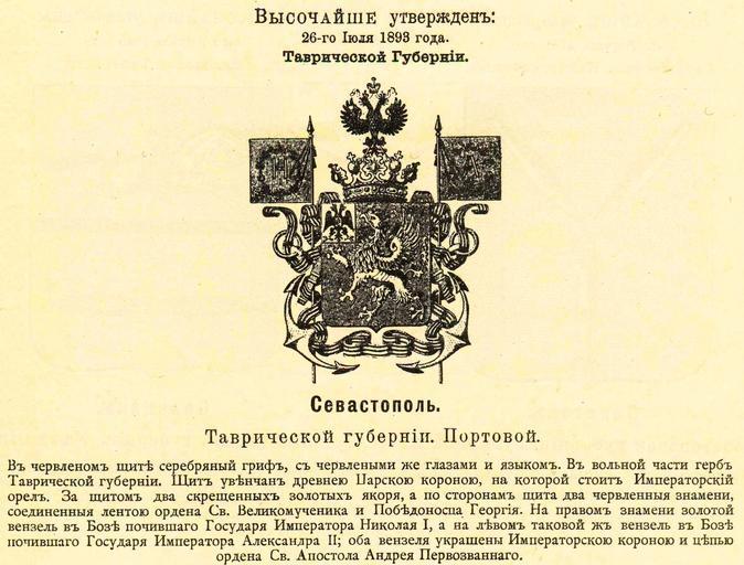 Keywords: Севастополь 1893 из Винклера.jpg Official Russian Empire coat of arms Sevastopol Ге б Российской Импе ии по тового го ода Севастополь Тав ической губе нии с официальным описанием в Ге бовнике Винкле а П П фон-Винкле Ге бы го одов губе ний областей и посадов Российской Импе ии внесенные в Полное Соб ание законов с 1649 по 1900 год Дозволено цензу ою С -Пете бу г 20 Июля 1899 года Издание книгото говца Ив Ив Иванова С -Пете бу г Типог афия И Комелова П яжка д 3 1899 \ Scanned by Vizu 1893 \ 1899 published П П фон Винкле \ Pavel von Vinkler PD-old PD-RusEmpire PD-RU-exempt coats of arms Gerbovnik Vinklera - City CoAs Coats of arms of Tavria Governorate Griffins in heraldry Coats of arms of Sevastopol |