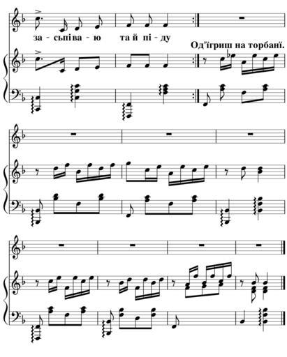 | Keywords: Зоря. Ноти. 1894. 06. III. Відортова пісня.2.svg uk Ілюст ація до статті иколи Лисенка а одні музичні ст ументи на Вк аїнї оти думки Г его а Відо та Відо това пісня 1894-03-27 Зо я часопис 1894 06 с 135-136 икола Лисенко other versions Часопис Зо я 1894 06 pdf Hidden background ECECEC; white;color black border 1px grey solid; padding 2px Created by MuseScore <nowiki> < xml version 1 0 encoding UTF-8 > <museScore version 2 06 > <programVersion>2 0 2</programVersion> <programRevision>f51dc11</programRevision> <Score> <LayerTag id 0 tag default ></LayerTag> <currentLayer>0</currentLayer> <Synthesizer> </Synthesizer> <Division>480</Division> <Style> <staffUpperBorder>4</staffUpperBorder> <maxSystemDistance>8</maxSystemDistance> <TextStyle> <halign>center</halign> <valign>baseline</valign> <xoffset>0</xoffset> <yoffset>6</yoffset> <offsetType>spatium</offsetType> <name>Lyrics Odd Lines</name> <family>FreeSerif</family> <size>14</size> <bold>1</bold> <sizeIsSpatiumDependent>1</sizeIsSpatiumDependent> </TextStyle> <TextStyle> <halign>center</halign> <valign>baseline</valign> <xoffset>0</xoffset> <yoffset>6</yoffset> <offsetType>spatium</offsetType> <name>Lyrics Even Lines</name> <family>FreeSerif</family> <size>14</size> <bold>1</bold> <sizeIsSpatiumDependent>1</sizeIsSpatiumDependent> </TextStyle> <TextStyle> <halign>left</halign> <valign>baseline</valign> <xoffset>0</xoffset> <yoffset>-4</yoffset> <offsetType>spatium</offsetType> <name>Tempo</name> <family>FreeSerif</family> <size>14</size> <bold>1</bold> <sizeIsSpatiumDependent>1</sizeIsSpatiumDependent> <systemFlag>1</systemFlag> </TextStyle> <page-layout> <page-height>1060 16</page-height> <page-width>850 394</page-width> <page-margins type even > <left-margin>5 66929</left-margin> <right-margin>5 66929</right-margin> <top-margin>0</top-margin> <bottom-margin>0</bottom-margin> </page-margins> <page-margins type odd > <left-margin>5 66929</left-margin> <right-margin>5 66929</right-margin> <top-margin>0</top-margin> <bottom-margin>0</bottom-margin> </page-margins> </page-layout> <Spatium>1 764</Spatium> </Style> <showInvisible>1</showInvisible> <showUnprintable>1</showUnprintable> <showFrames>1</showFrames> <showMargins>0</showMargins> <metaTag name arranger ></metaTag> <metaTag name composer ></metaTag> <metaTag name copyright ></metaTag> <metaTag name creationDate >2015-11-20</metaTag> <metaTag name lyricist ></metaTag> <metaTag name movementNumber ></metaTag> <metaTag name movementTitle ></metaTag> <metaTag name platform >Microsoft Windows</metaTag> <metaTag name poet ></metaTag> <metaTag name source ></metaTag> <metaTag name translator ></metaTag> <metaTag name workNumber ></metaTag> <metaTag name workTitle ></metaTag> <PageList> <Page> <System> </System> <System> </System> </Page> <Page> <System> </System> <System> </System> <System> </System> </Page> </PageList> <Part> <Staff id 1 > <StaffType group pitched > <name>stdNormal</name> </StaffType> <bracket type -1 span 0 /> </Staff> <trackName>Voice</trackName> <Instrument> <trackName>Voice</trackName> <minPitchP>36</minPitchP> <maxPitchP>94</maxPitchP> <minPitchA>40</minPitchA> <maxPitchA>79</maxPitchA> <instrumentId>voice vocals</instrumentId> <Articulation> <velocity>100</velocity> <gateTime>100</gateTime> </Articulation> <Articulation name staccatissimo > <velocity>100</velocity> <gateTime>33</gateTime> </Articulation> <Articulation name staccato > <velocity>100</velocity> <gateTime>50</gateTime> </Articulation> <Articulation name portato > <velocity>100</velocity> <gateTime>67</gateTime> </Articulation> <Articulation name tenuto > <velocity>100</velocity> <gateTime>100</gateTime> </Articulation> <Articulation name marcato > <velocity>120</velocity> <gateTime>67</gateTime> </Articulation> <Articulation name sforzato > <velocity>120</velocity> <gateTime>100</gateTime> </Articulation> <Channel> <program value 52 /> <synti>Fluid</synti> </Channel> </Instrument> </Part> <Part> <Staff id 2 > <StaffType group pitched > <name>stdNormal</name> </StaffType> <bracket type 1 span 2 /> </Staff> <Staff id 3 > <StaffType group pitched > <name>stdNormal</name> </StaffType> <bracket type -1 span 0 /> </Staff> <trackName>Theorbo</trackName> <Instrument> <trackName>Theorbo</trackName> <minPitchP>31</minPitchP> <maxPitchP>71</maxPitchP> <minPitchA>31</minPitchA> <maxPitchA>71</maxPitchA> <instrumentId>pluck theorbo</instrumentId> <StringData> <frets>13</frets> <string open 1 >31</string> <string open 1 >33</string> <string open 1 >35</string> <string open 1 >36</string> <string open 1 >38</string> <string open 1 >40</string> <string open 1 >41</string> <string open 1 >43</string> <string>45</string> <string>50</string> <string>55</string> <string>59</string> <string>52</string> <string>57</string> </StringData> <Articulation> <velocity>100</velocity> <gateTime>100</gateTime> </Articulation> <Articulation name staccatissimo > <velocity>100</velocity> <gateTime>33</gateTime> </Articulation> <Articulation name staccato > <velocity>100</velocity> <gateTime>50</gateTime> </Articulation> <Articulation name portato > <velocity>100</velocity> <gateTime>67</gateTime> </Articulation> <Articulation name tenuto > <velocity>100</velocity> <gateTime>100</gateTime> </Articulation> <Articulation name marcato > <velocity>120</velocity> <gateTime>67</gateTime> </Articulation> <Articulation name sforzato > <velocity>120</velocity> <gateTime>100</gateTime> </Articulation> <Channel> <program value 25 /> <synti>Fluid</synti> </Channel> </Instrument> </Part> <Staff id 1 > <Measure number 1 > <KeySig> <accidental>-1</accidental> </KeySig> <TimeSig> <sigN>2</sigN> <sigD>4</sigD> <showCourtesySig>1</showCourtesySig> </TimeSig> <Tempo> <tempo>1 16667</tempo> <pos x -6 01102 y -1 45 /> <text>Moderato rubato </text> </Tempo> <Chord> <durationType>eighth</durationType> <Lyrics> <