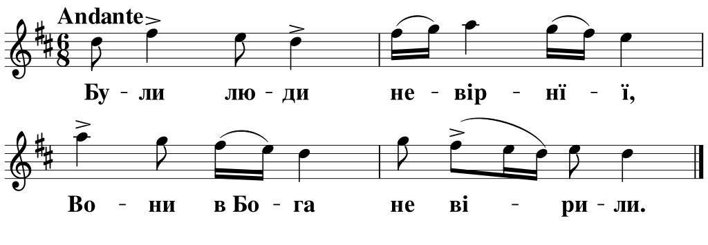 | Keywords: Зоря. Ноти. 1894. 08. III. Кант Юрию.svg uk Ілюст ація до статті иколи Лисенка а одні музичні ст ументи на Вк аїнї оти канта Ю ию 1894-04-27 Зо я часопис 1894 08 с 186 икола Лисенко other versions Часопис Зо я 1894 08 pdf Hidden background ECECEC; white;color black border 1px grey solid; padding 2px Created by MuseScore <nowiki> < xml version 1 0 encoding UTF-8 > <museScore version 2 06 > <programVersion>2 0 2</programVersion> <programRevision>f51dc11</programRevision> <Score> <LayerTag id 0 tag default ></LayerTag> <currentLayer>0</currentLayer> <Synthesizer> </Synthesizer> <Division>480</Division> <Style> <staffUpperBorder>4</staffUpperBorder> <TextStyle> <halign>center</halign> <valign>baseline</valign> <xoffset>0</xoffset> <yoffset>6</yoffset> <offsetType>spatium</offsetType> <name>Lyrics Odd Lines</name> <family>FreeSerif</family> <size>14</size> <bold>1</bold> <sizeIsSpatiumDependent>1</sizeIsSpatiumDependent> </TextStyle> <TextStyle> <halign>left</halign> <valign>baseline</valign> <xoffset>0</xoffset> <yoffset>-4</yoffset> <offsetType>spatium</offsetType> <name>Tempo</name> <family>FreeSerif</family> <size>14</size> <bold>1</bold> <sizeIsSpatiumDependent>1</sizeIsSpatiumDependent> <systemFlag>1</systemFlag> </TextStyle> <page-layout> <page-height>294 803</page-height> <page-width>850 394</page-width> <page-margins type even > <left-margin>5 66929</left-margin> <right-margin>5 66929</right-margin> <top-margin>56 6929</top-margin> <bottom-margin>113 386</bottom-margin> </page-margins> <page-margins type odd > <left-margin>5 66929</left-margin> <right-margin>5 66929</right-margin> <top-margin>0</top-margin> <bottom-margin>0</bottom-margin> </page-margins> </page-layout> <Spatium>1 764</Spatium> </Style> <showInvisible>1</showInvisible> <showUnprintable>1</showUnprintable> <showFrames>1</showFrames> <showMargins>0</showMargins> <metaTag name arranger ></metaTag> <metaTag name composer ></metaTag> <metaTag name copyright ></metaTag> <metaTag name creationDate >2015-11-22</metaTag> <metaTag name lyricist ></metaTag> <metaTag name movementNumber ></metaTag> <metaTag name movementTitle ></metaTag> <metaTag name platform >Microsoft Windows</metaTag> <metaTag name poet ></metaTag> <metaTag name source ></metaTag> <metaTag name translator ></metaTag> <metaTag name workNumber ></metaTag> <metaTag name workTitle ></metaTag> <PageList> <Page> <System> </System> <System> </System> </Page> </PageList> <Part> <Staff id 1 > <StaffType group pitched > <name>stdNormal</name> </StaffType> <bracket type -1 span 0 /> </Staff> <trackName>Violin</trackName> <Instrument> <longName>Violin</longName> <shortName>Vln </shortName> <trackName>Violin</trackName> <minPitchP>55</minPitchP> <maxPitchP>103</maxPitchP> <minPitchA>55</minPitchA> <maxPitchA>88</maxPitchA> <instrumentId>strings violin</instrumentId> <Articulation> <velocity>100</velocity> <gateTime>100</gateTime> </Articulation> <Articulation name staccatissimo > <velocity>100</velocity> <gateTime>33</gateTime> </Articulation> <Articulation name staccato > <velocity>100</velocity> <gateTime>50</gateTime> </Articulation> <Articulation name portato > <velocity>100</velocity> <gateTime>67</gateTime> </Articulation> <Articulation name tenuto > <velocity>100</velocity> <gateTime>100</gateTime> </Articulation> <Articulation name marcato > <velocity>120</velocity> <gateTime>67</gateTime> </Articulation> <Articulation name sforzato > <velocity>120</velocity> <gateTime>100</gateTime> </Articulation> <Channel> <program value 40 /> <synti>Fluid</synti> </Channel> <Channel name pizzicato > <program value 45 /> <synti>Fluid</synti> </Channel> <Channel name tremolo > <program value 44 /> <synti>Fluid</synti> </Channel> </Instrument> </Part> <Staff id 1 > <Measure number 1 > <KeySig> <accidental>2</accidental> </KeySig> <TimeSig> <sigN>6</sigN> <sigD>8</sigD> <showCourtesySig>1</showCourtesySig> </TimeSig> <Tempo> <tempo>1 16667</tempo> <pos x -4 11826 y -1 15 /> <text>Andante</text> </Tempo> <Chord> <durationType>eighth</durationType> <Lyrics> <syllabic>begin</syllabic> <text>Бу</text> </Lyrics> <Note> <pitch>74</pitch> <tpc>16</tpc> </Note> </Chord> <Chord> <durationType>quarter</durationType> <Articulation> <subtype>sforzato</subtype> </Articulation> <Lyrics> <syllabic>end</syllabic> <text>ли</text> </Lyrics> <Note> <pitch>78</pitch> <tpc>20</tpc> </Note> </Chord> <Chord> <durationType>eighth</durationType> <Lyrics> <syllabic>begin</syllabic> <text>лю</text> </Lyrics> <Note> <pitch>76</pitch> <tpc>18</tpc> </Note> </Chord> <Chord> <durationType>quarter</durationType> <Articulation> <subtype>sforzato</subtype> </Articulation> <Lyrics> <syllabic>end</syllabic> <text>ди</text> </Lyrics> <Note> <pitch>74</pitch> <tpc>16</tpc> </Note> </Chord> </Measure> <Measure number 2 > <LayoutBreak> <subtype>line</subtype> </LayoutBreak> <Slur id 2 > <track>0</track> </Slur> <Chord> <durationType>16th</durationType> <Lyrics> <syllabic>begin</syllabic> <text>не</text> </Lyrics> <Slur type start id 2 /> <Note> <pitch>78</pitch> <tpc>20</tpc> </Note> </Chord> <Chord> <durationType>16th</durationType> <Slur type stop id 2 /> <Note> <pitch>79</pitch> <tpc>15</tpc> </Note> </Chord> <Chord> <durationType>quarter</durationType> <Lyrics> <syllabic>middle</syllabic> <text>ві </text> </Lyrics> <Note> <pitch>81</pitch> <tpc>17</tpc> </Note> </Chord> <Slur id 3 > <track>0</track> </Slur> <Chord> <durationType>16th</durationType> <Lyrics> <syllabic>middle</syllabic> <text>нї</text> </Lyrics> <Slur type start id 3 /> <Note> <pitch>79</pitch> <tpc>15</tpc> </Note> </Chord> <Chord> <durationType>16th</durationType> <Slur type stop id 3 /> <Note> <pitch>78</pitch> <tpc>20</tpc> </Note> </Chord> <Chord> <durationType>quarter</durationType> <Lyrics> <syllabic>end</syllabic> <text>ї </text> </Lyrics> <Note> <pitch>76</pitch> <tpc>18</tpc> </Note> </Chord> </Meas