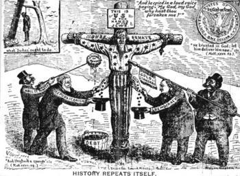 | Keywords: 18960415 antisemitic political cartoon in Sound Money.jpg History Repeats Itself This is the U S in the Hands of the Jews Anti-Semitic USA political cartoon in 1896 Portrays Uncle Sam being crucified like Jesus Two figures labeled Wall Street Pirates with caricatured Jewish features poke him with a spear and raise a poisoned sponge to his lips The tub of poison is labeled Debt the poisoned sponge Interest on Bonds and the spear Single Gold Standard Below figures labeled Republicanism Caricature of James G Blaine and Democracy Caricature of Grover Cleveland pick Uncle Sam's pockets http //projects vassar edu/1896/0415csm jpg April 15 1896 issue of Sound Money magazine Watson Heston PD old also appears in Christ Killers The Jews and the Passion from the Bible to the Big Screen by Jeremy Cohen 2007 Oxford University Press ISBN 0195178416 p 140 PD-old 1896 cartoons 1890s political cartoons of the United States Caricatures of Grover Cleveland Caricatures of James G Blaine Uncle Sam Crucifixion Bimetallism in the United States United States government debt Antisemitic_pictures Antisemitism in the United States Pickpockets Thieves in art |