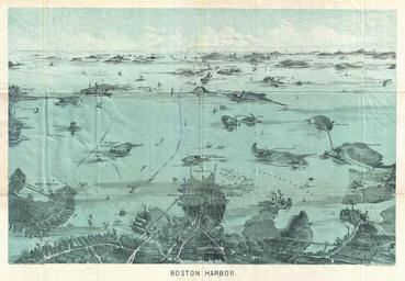 Keywords: 1897 Walker View of Boston Harbor - Geographicus - Boston-walker-1897.jpg This is an attractive two color lithograph1897 view of Boston Harbor by George H Walker Co Covers Boston harbor in full with its many islands light houses forts and communities The map part of the map covers Boston South Boston and East Boston naming many individual streets and buildings Also shows Deer island Governor's Island Castle Island Thompson's Island Moon Island Squantum Long Island and countless others Shows steam ship routes between the island as well as ferry lines 1897 dated Size in 18 14 object history credit line accession number Boston-walker-1897 Geographicus-source PD-art Boston Harbor in the 19th century