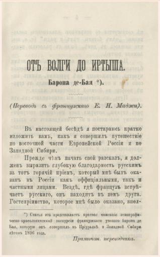 Keywords: См. также: Записки УОЛЕ. Т. 17. Вып. 2: Де-Бай И.А. От Волги до Иртыша. Т. 18. 1896: Отчеты Общества за 1895 год. Источник: <a href="http://pdfview.tonb.ru:8088/Default.aspx?bd=EI&amp;mfn=10436" rel="nofollow">pdfview.tonb.ru:8088/Default.aspx?bd=EI&amp;mfn=10436</a> france 1898 1896 перевод экспедиция барондебай bayejoseph