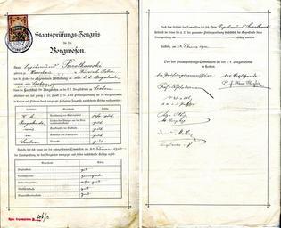 | Keywords: 1900 Leoben egzaminy.jpg en both pages of original state certificate after final exams in K und K Bergakademie zu Leoben pl obie strony państwowego certyfikatu o zdaniu egzaminów na zakończenie studiów w Cesarsko-Królewskiej Akademii Górniczej w Leoben own Julo 1900-02-24 Julo Zygmunt Szczotkowski Montanuniversität Leoben History of Leoben |