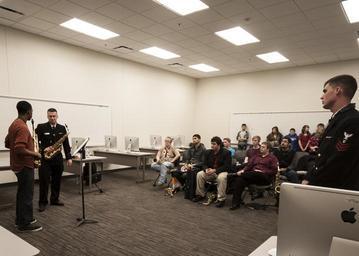 | Keywords: indoor 120219-N-ZS489-001 COMMERCE, Tx. (Feb. 19, 2014) Musicians of the U.S. Navy Band perform recitals and facilitate masterclasses for students at Texas A&M University- Commerce prior to the U.S. Navy Concert Band's performance on campus that evening. The U.S. Navy Concert Band, based in Washington and commanded by Capt. Brian O. Walden, is currently on a 24-day tour of seven states. One of the band's primary responsibilities, national tours increase awareness of the Navy in palces that don't see the Navy at work on a regular basis. (U.S. Navy photo by Musician 1st Class Adele Mayne/Released) 120219-N-ZS489-001 COMMERCE, Tx. (Feb. 19, 2014) Musicians of the U.S. Navy Band perform recitals and facilitate masterclasses for students at Texas A&M University- Commerce prior to the U.S. Navy Concert Band's performance on campus that evening. The U.S. Navy Concert Band, based in Washington and commanded by Capt. Brian O. Walden, is currently on a 24-day tour of seven states. One of the band's primary responsibilities, national tours increase awareness of the Navy in palces that don't see the Navy at work on a regular basis. (U.S. Navy photo by Musician 1st Class Adele Mayne/Released) |