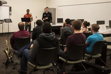 | Keywords: people 120219-N-ZS489-001 COMMERCE, Tx. (Feb. 19, 2014) Musicians of the U.S. Navy Band perform recitals and facilitate masterclasses for students at Texas A&M University- Commerce prior to the U.S. Navy Concert Band's performance on campus that evening. The U.S. Navy Concert Band, based in Washington and commanded by Capt. Brian O. Walden, is currently on a 24-day tour of seven states. One of the band's primary responsibilities, national tours increase awareness of the Navy in palces that don't see the Navy at work on a regular basis. (U.S. Navy photo by Musician 1st Class Adele Mayne/Released) 120219-N-ZS489-001 COMMERCE, Tx. (Feb. 19, 2014) Musicians of the U.S. Navy Band perform recitals and facilitate masterclasses for students at Texas A&M University- Commerce prior to the U.S. Navy Concert Band's performance on campus that evening. The U.S. Navy Concert Band, based in Washington and commanded by Capt. Brian O. Walden, is currently on a 24-day tour of seven states. One of the band's primary responsibilities, national tours increase awareness of the Navy in palces that don't see the Navy at work on a regular basis. (U.S. Navy photo by Musician 1st Class Adele Mayne/Released) |