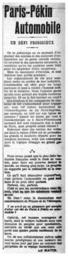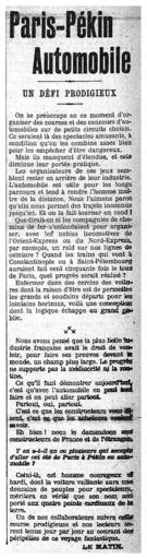 | Keywords: 1907 january pekin-paris pekinparis peking-paris pekingparis le matin lematin french newspaper frenchnewspaper матин французская газета французскаягазета пекин-париж пекинпариж bnf national library of france nationallibraryoffrance bibliothèque nationale de france bibliothèquenationaledefrance gallica национальная библиотека франции национальнаябиблиотекафранции blackandwhite monochrome text black and white Версия перевода. Умопомрачительный вызов! Paris-Pekin Automobile Un Défi Prodigieux - On se préoccupe en ce moment d'organiser des courses at des concours d'automobiles sur de petits circuits choisis. Ce seraient là des spectacles amusants, à condition qu‘on les combine assez bien pour les empêcher d'être dangeraux. - Mais ils manquent d‘étendue, et cela diminue leur portée pratique. - Les organisateurs de ces jeux semblent rester en arriére de leur industrie. L'automobile est utile pour les longs parcours et tend à rendre l‘homme maitre de la distance. Nous l'aimons parce qu’elle nous permet des trajets inconnus jusqu’ici. Et on la fait tourner en rond! - Que dirait-on si les compagnies de chemins de fer s'entendaient pour organiser, avec les nobles locomotives de l'Orient-Express ou du Nord-Express, par exemple, un raid sur nos lignes de ceinture? Quand les trains qui vont à Constantinople ou à Saint-Pétersbourg auraient fait cent cinquante fois le tour de Paris, quel progrés serait réalisé? - Enfermer dans des cercles des voitures dont la raison d'etre est de permettre les grands et soudains départs pour les lointains horizons, voilà une conception dont la logique échappe au grand public. *** Nous avons pensé qua la plus belle industrie française avait le droit de vouloir, pour faire ses preuves devant le monde, un champ plus large. Le progres ne supporte pas la médiocrité ni la routine. - Ce qu'il faut démontrer anjourd... c'est qu'avec I’automobile on pent ...faire et on peut aller partout. Partout, oui, partout. - C'est ce que les constructeurs vous disent, c'est ce que les acheteurs ... savoir. - Eh bien! nous le demandons ... constructeurs de France et de l'etranger. Y en a-it-il un ou plusieurs qui accepts d'aller cet ete de Paris a Pekin en automobile? - Celui-la, cet homme courageux et hardi, dont la voiture vaillante aura une douzaine de peuples pour spectateurs, meritera en verite que son nom, soit porte aux quatre points cardinaux de la terre. Un de nos collaborateurs suivra cette course prodigieuse et nos lecteurs seront tenus jour par jour au courant des peripeties de ce voyage fantastique. Le Matin gallica.bnf.fr/ark:/12148/bpt6k5682280 Версия перевода. Умопомрачительный вызов! Paris-Pekin Automobile Un Défi Prodigieux - On se préoccupe en ce moment d'organiser des courses at des concours d'automobiles sur de petits circuits choisis. Ce seraient là des spectacles amusants, à condition qu‘on les combine assez bien pour les empêcher d'être dangeraux. - Mais ils manquent d‘étendue, et cela diminue leur portée pratique. - Les organisateurs de ces jeux semblent rester en arriére de leur industrie. L'automobile est utile pour les longs parcours et tend à rendre l‘homme maitre de la distance. Nous l'aimons parce qu’elle nous permet des trajets inconnus jusqu’ici. Et on la fait tourner en rond! - Que dirait-on si les compagnies de chemins de fer s'entendaient pour organiser, avec les nobles locomotives de l'Orient-Express ou du Nord-Express, par exemple, un raid sur nos lignes de ceinture? Quand les trains qui vont à Constantinople ou à Saint-Pétersbourg auraient fait cent cinquante fois le tour de Paris, quel progrés serait réalisé? - Enfermer dans des cercles des voitures dont la raison d'etre est de permettre les grands et soudains départs pour les lointains horizons, voilà une conception dont la logique échappe au grand public. *** Nous avons pensé qua la plus belle industrie française avait le droit de vouloir, pour faire ses preuves devant le monde, un champ plus large. Le progres ne supporte pas la médiocrité ni la routine. - Ce qu'il faut démontrer anjourd... c'est qu'avec I’automobile on pent ...faire et on peut aller partout. Partout, oui, partout. - C'est ce que les constructeurs vous disent, c'est ce que les acheteurs ... savoir. - Eh bien! nous le demandons ... constructeurs de France et de l'etranger. Y en a-it-il un ou plusieurs qui accepts d'aller cet ete de Paris a Pekin en automobile? - Celui-la, cet homme courageux et hardi, dont la voiture vaillante aura une douzaine de peuples pour spectateurs, meritera en verite que son nom, soit porte aux quatre points cardinaux de la terre. Un de nos collaborateurs suivra cette course prodigieuse et nos lecteurs seront tenus jour par jour au courant des peripeties de ce voyage fantastique. Le Matin gallica.bnf.fr/ark:/12148/bpt6k5682280 |