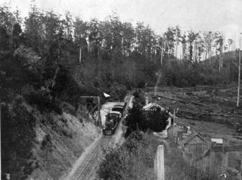 Keywords: train railway locomotive narrow gauge station tasmania blackandwhite monochrome outdoor black and white Denison Gorge station on the North East Line. T R G Williams photo Denison Gorge station on the North East Line. T R G Williams photo