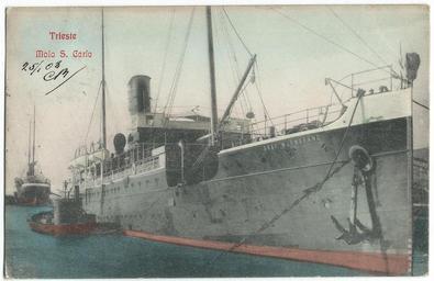 | Keywords: 19080125 trieste molo s carlo.jpg fr Vue de Trieste au début du XXe siècle 1908-01-25 Vintage postcards private collection author other versions PD-old-70-1923 Port of Trieste Graf Wurmbrand ship 1895 Ships in Trieste Molo Audace Trieste Postcards of Austria-Hungary Trieste in the 1900s Postcards uploaded by user Jean Housen Uploaded with UploadWizard |