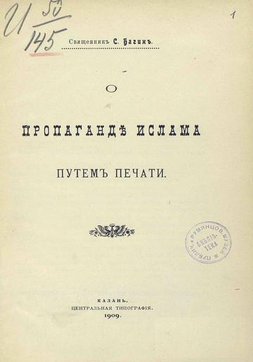 Keywords: Багин, Сергей Афанасьевич. О пропаганде ислама путем печати / Свящ. С. Багин. - Казань : Центр. тип., 1909. - 31 с.; 23. В конце текста: и. д. епархиального миссионера свящ. Сергий Багин <a href="http://dlib.rsl.ru/rsl01003000000/rsl01003755000/rsl01003755446/rsl01003755446.pdf" rel="nofollow">dlib.rsl.ru/rsl01003000000/rsl01003755000/rsl01003755446/...</a> 1909 пропаганда ленинка ргб оцифровка противомусульманскаямиссия электронныйресурсргб историяказани историятатарстана