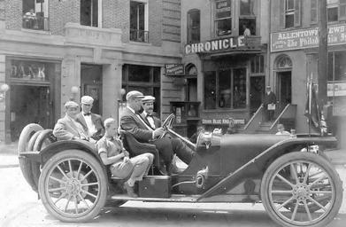 | Keywords: 1909 - American Underslung Automobile in Center Square.jpg en Roy Iredell sitting behind the wheel of a 1909 American Underslung automobile in the Southwest Corner of Center Square In the rear seat is Rodney Iredell The family owned the Chronicle and News 1909 Ann Bartholomew Author Carol M Front Author 2002 Allentown Images of America Arcadia Publishing April 8 2002 ISBN-10 0738509965 Undetermined photographers other versions Custom license marker 2015 10 24 PD-Old 1900s in Allentown Pennsylvania Center Square Allentown Pennsylvania Transportation in Allentown Pennsylvania Uploaded with UploadWizard |