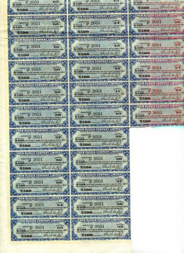| Keywords: 1910. Новороссийское общество NRC009.jpg en Share Certificate No 2601 for 100 UK Pounds Sterling - New Russia Company Limited - Printed Published by Waterlow Sons London England - 6th April 1910 - The Original Share Certificate No 2601 is owned by Dr David E Probert and is in the Probert Family Archives Edwin James Williams - Great Great Grandfather of Dr David E Probert was employed by the New Russia Company Limited in the town of Hughesovka since 1961 - Donetsk as its Chief Mining Geologist from the 1870s to around 1905 1910 originally printed by Waterlow Sons London UK photographed by Dr David E Probert http //www valentina net/NRC/ Ди екция ово оссийского общества Directors of the New Russia Company Limited - Signed by Director - Archibald Balfour July 1840 - October 1922 other versions Custom license marker 2014 11 07 PD-old Files uploaded by Andrew Butko from various sources 20th century Stock certificates of New Russia Coal Iron and Rail-making Company Historical non-photos images of Donetsk by alphabet 1910 in Donetsk Uploaded with UploadWizard |