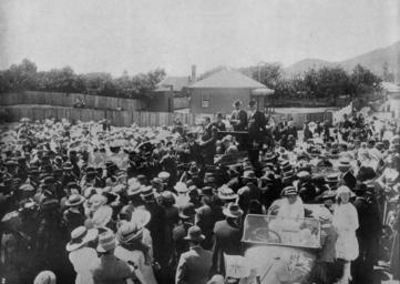 | Keywords: tasmania blackandwhite monochrome crowd people outdoor black and white Staverton (Roland) branch opening. Crowds and official train at Sheffield. Spurling photo Staverton (Roland) branch opening. Crowds and official train at Sheffield. Spurling photo |