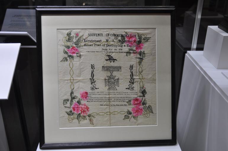 Keywords: 1916 Souvenir of destroying an airship.JPG Pictures from RAF Museum Hendon Souvenir of the destruction of a Zeppelin by an Royal Flying Corps pilot 3 Sep 1916 Printed on tissue paper with watercolour design this souvenir commemorates an RAF pilot shooting down a German Zeppelin airship Text Souvenir in Commemoration of Lieutenant W L Robinson's Great Feat of Destroying a Zeppelin Sunday sept 3rd 1916 His greatest reward the Heartfelt Thanks of every Woman and Child in England His Majestry the King has been graciously pleased to award the Victoria Cross to Lieut William Leefe Robinson Worcester Regt and R F C for most conspicuous bravery He attacked an enemy airship under circumstances of great difficulty and danger and sent it creashing to the ground a flaming wreck He had been in the air for more than two hours and had previously attacked another airship during his flight Printer S Burgess York Place Strand London WC on display at RAF Museum London Photo own work 2014-07-17 18 21 17 Original author not known but probably the printer S Burgess of York Place Photo by User The Land Pd-old World War I Zeppelins raids on London 1916 in London Souvenirs RAF Museum London |