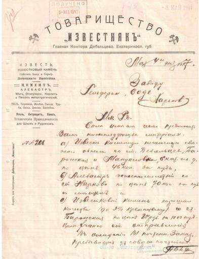 Keywords: 1917. Коммерческое предложение товарищества Известняк.jpg Комме ческое п едложение това ищества «Известняк Дебальцево Екате инославская губе ния от 4 мая 1917 г П едлагается известь алебаст известковый камень заводу «Соде» из Ха ькова http //forum gp dn ua/viewtopic php f 43 t 870 1917 това ищество «Известняк PD-RusEmpire 1917 in Debaltsevo Economy of Debaltseve Documents of Donetsk Oblast |