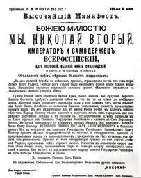 | Keywords: 1917 март Отречение Николая II манифест.jpg От ечение от п естола Божией милостью Импе ато а и Самоде жца Все оссийского иколая II анифест П иложение к Подольским губе нским ведомостям 18 от 1917 года Цена манифеста 6 копеек В документе указано место подписания - го од Псков; на самом деле - станция Дно Свой скан by Vizu Scanned by User Vizu Date 1917 03 02 ru иколай Романов See also File От ечение от п естола импе ато а иколая II 2 ма та 1917 jpg PD-old-70 PD-RusEmpire PD-ineligible Original upload log ru wikipedia Infovarius page ru wikipedia 1917_ D0 BC D0 B0 D1 80 D1 82_ D0 9E D1 82 D1 80 D0 B5 D1 87 D0 B5 D0 BD D0 B8 D0 B5_ D0 9D D0 B8 D0 BA D0 BE D0 BB D0 B0 D1 8F_II_ D0 BC D0 B0 D0 BD D0 B8 D1 84 D0 B5 D1 81 D1 82 jpg 2010-12-24 04 18 Vizu 1410×1780× 541637 bytes <nowiki> Описание От ечение от п естола импе ато а иколая II 2 ма та 1917 ашинопись Авто иколай Романов В емя создания 1917 Источник http //rusarchives ru/evants/exhibitions/1917-myths-kat/34 shtml PD-old PD-RusEmpire PD-ineligible Катего ия Изоб ажения Пе вая ми овая война Катего ия Изоб ажения 1917</nowiki> Nicholas II of Russia's abdication History of Pskov 1917 in Podolia Governorate |