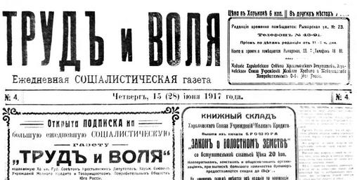 Keywords: Труд и Воля 1917-06-28.jpg Газета «Т удъ и Воля» у едакції якої п ацював Анд ій Заливчий оме газети за 15 28 че вня 1917 оку 1917-06-28 Scan by AMY <span class signature-talk ></span> PD-Art Andrii Zalyvchyi