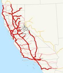 | Keywords: 1920 California state highways.svg This is a map of California's state highway system constructed and proposed routes as it existed in 1920 Routes are color-coded by how they were added red for the bond issues 1910 1916 1919 with the darkest red in 1910 and black for roads added by legislative acts 1895-1919 If a road was legislated but also in a bond issue it is shown as red Email me if you would like a copy of the GIS data I created for the highways 2007-12-03 own assumed NE2 Maps of California's state highway system |