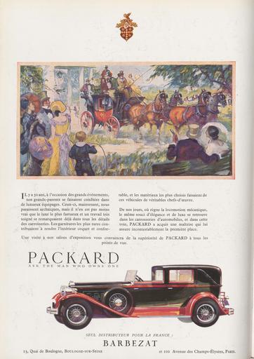 | Keywords: 1930 vogue bibliothèque nationale de france bibliothèquenationaledefrance bnf gallica français национальная библиотека франции национальнаябиблиотекафранции иллюстрированный журнал иллюстрированныйжурнал мода и автомобиль модаиавтомобиль история моды историямоды история рекламы историярекламы packard Il y a 50 ans, a l’occasion des grands événements, nos grands-parents se faisaient conduire dans de luxueux équipages. Ceux-ci, maintenant, nous paraissent archaiques, mais il n’en est pas moins vrai que le luxe‘ le plus fastueux et un travail tres soigné se remarquaient deja dans tous les détails des carrosseries. Les garnitures les plus rares contribuaient a rendre l’interieur coquet et confortable, et les materiaux les plus choisis faisaient de ces véhicules de véritables chefs-d’oeuvre.  De nos jours, ou regne la locomotion mecanique, le méme souci d’elégance et de luxe se retrouve dans les carrosseries d’automobiles, et dans cette voie, PACKARD a acquis une maitrise qui lui assure incontestablement la premiere place.  Une visite a nos salons d’exposition vous convaincra de la superiorité de PACKARD a tous les points de vue.  PACKARD ASK THE MAN WHO OWNS ONE  SEUL DISTRIBUTEUR POUR LA FRANCE : BARBEZAT  I3, Quai de Boulogne, BOULOGNE-SUR-SEINE et 102 Avenue des Champs-Elysées, PARIS. gallica.bnf.fr/ark:/12148/cb343833568/date1930 Il y a 50 ans, a l’occasion des grands événements, nos grands-parents se faisaient conduire dans de luxueux équipages. Ceux-ci, maintenant, nous paraissent archaiques, mais il n’en est pas moins vrai que le luxe‘ le plus fastueux et un travail tres soigné se remarquaient deja dans tous les détails des carrosseries. Les garnitures les plus rares contribuaient a rendre l’interieur coquet et confortable, et les materiaux les plus choisis faisaient de ces véhicules de véritables chefs-d’oeuvre.  De nos jours, ou regne la locomotion mecanique, le méme souci d’elégance et de luxe se retrouve dans les carrosseries d’automobiles, et dans cette voie, PACKARD a acquis une maitrise qui lui assure incontestablement la premiere place.  Une visite a nos salons d’exposition vous convaincra de la superiorité de PACKARD a tous les points de vue.  PACKARD ASK THE MAN WHO OWNS ONE  SEUL DISTRIBUTEUR POUR LA FRANCE : BARBEZAT  I3, Quai de Boulogne, BOULOGNE-SUR-SEINE et 102 Avenue des Champs-Elysées, PARIS. gallica.bnf.fr/ark:/12148/cb343833568/date1930 |