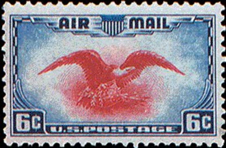 | Keywords: 1938 airmail stamp C23.jpg en May 14 1938 <br /> 5¢ Carmine Blue <br /> Eagle Shield <br /> C23 <br /> <br /> 349 946 500 U S Post Office Bureau of Engraving and Printing; Scanned by uploader 1938-05-14 Airmail stamps of the United States 1938 stamps PD-USGov |