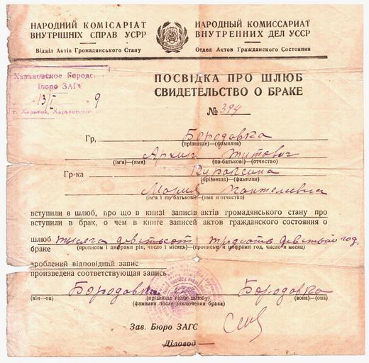 Keywords: 1939 Свидетельство о браке Харьков.jpg КВД УССР Ха ьковское Го одское Бю о ЗАГС Свидетельство о б аке scanned official paper doc by user Vizu 1939-01-13 а одный комисса иат внут енних дел УССР PD-RU-exempt documents USSR PD-UA-exempt documents UkrSSR PD-old-70 Documents of Kharkiv Documents of Ukrainian SSR Documents of NKVD 1939 in Kharkiv Marriage certificates of the Soviet Union |