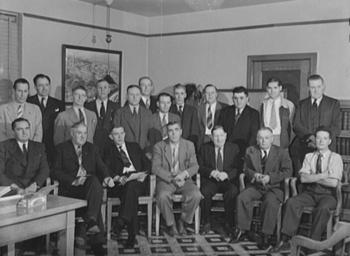| Keywords: 1942-anaconda-LMC.jpg en Butte Montana Anacoda Copper Mining Company The victory labor-management production committee of the Butte mines meets regularly In the back row from left to right are J A Livingston Anacoda Copper Mining Company; E I Renouard assistant general superintendent ACM; H J Rahilly assistant general superintendent ACM; Charles Black Butte miners' union; John Downs boiler makers' union; W J McMahon commissioner of labor of ACM; John F Bird electricians' union; J P Ryan foreman of ACM; Ira Steck superintendent electrical department of ACM; James Cusick machinists' union; John J Mickelson Butte miners' union; Eugene Hogan superintendent ACM In the front row reading from left to right are Edward S McGlone general superintendednt ACM; Bert Riley Butte miners' union; Dennis McCarthy Butte miners' union; Arthur C Bigley ACM; Carl Stenberg painters' union; John Eathorne foreman of ACM; John Gaffney cappenters' union Library of Congress http //hdl loc gov/loc pnp/fsa 8d08406 Creator Russell Lee 1942-09 Farm Security Administration - Office of War Information Photograph Collection Library of Congress PD-USGov Butte Montana Butte Anaconda and Pacific Railway Trade unionism Labor Management Committees 1942 in Montana September 1942 in the United States Anaconda Copper |