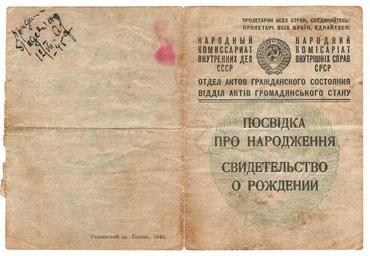 | Keywords: 1945 Свидетельство о рождении А.jpg en Ukrainian Soviet socialist Republic ru Свидетельство о ождении КВД СССР на усском и ук аинском языках 1940 печать 1945 заполнено Обложка 1940 print own scan doc NKVD USSR Official documents The public domain paragraph C <gallery>File 1943 Свидетельство о ождении А jpg File 1945 Свидетельство о ождении Б jpg</gallery> PD-UA-exempt documents UkrSSR PD-RU-exempt documents USSR PD-old-70 1940 print PD-ineligible text Documents of Kharkiv Documents of NKVD Documents of Ukrainian SSR Unidentified year in Kharkiv Birth certificates of the Soviet Union |