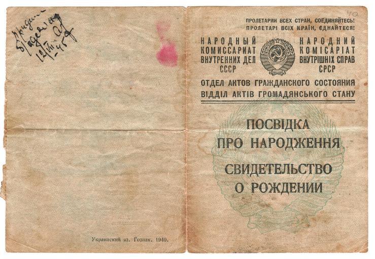 | Keywords: 1945 Свидетельство о рождении А.jpg  en Ukrainian Soviet socialist Republic ru Свидетельство о  ождении  КВД СССР на  усском и ук аинском языках 1940 печать 1945 заполнено Обложка 1940 print own scan doc NKVD USSR Official documents The public domain paragraph C <gallery>File 1943 Свидетельство о  ождении А jpg File 1945 Свидетельство о  ождении Б jpg</gallery> PD-UA-exempt documents UkrSSR PD-RU-exempt documents USSR PD-old-70 1940 print PD-ineligible text Documents of Kharkiv Documents of NKVD Documents of Ukrainian SSR Unidentified year in Kharkiv Birth certificates of the Soviet Union |