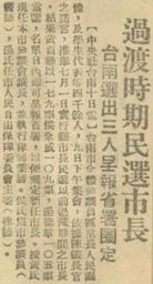 | Keywords: 1947-3-9臺南市選出過渡時期民選市長候選人 Newspaper concerning aftermath (Residents of Tainan elected 3 Mayoral Candidates) of the 228 Incident of TAIWAN.jpeg zh-tw 台南市全體參議員 里長人民 體,及學生代表等,03 09日下午集 , 陳 長官諾 ,推舉07 01日行縣市長民選以前過渡 間之市長,結 黃百祿 侯全成 湯德章當選 1947-03-10 http //catalog digitalarchives tw/item/00/29/87/55 html author According to the http //law moj gov tw/Eng/LawClass/LawAll aspx PCode J0070017 Copyright Act of the Republic of China Taiwan Article 32 Economic rights in a pseudonymous work or an anonymous work endure for fifty years from the time of public release; provided the economic rights shall be extinguished where it can be proven that the author has been deceased for over fifty years The provisions of the preceding paragraph shall not apply when the pseudonym of the author is well known to the public Article 33 Economic rights in works authored by a juristic person endure for fifty years after the public release of the work; provided if the work is not publicly released within fifty years from the completion of the creation the economic rights shall subsist for fifty years after completion of the creation 中華民 著 權法 : 第三十二 別著著 或不具名著 之著 財產權存續 間 別名著 或不具名著 之著 財產權,存續至著 公開發表後五十年 但可證明其著 人死亡已 五十年 ,其著 財產權消滅 前項規定,於著 人之別名為 周知 ,不適用之 第三十三 法人為著 人之著 財產權存續 間 法人為著 人之著 ,其著 財產權存續至其著 公開發表後五十年 但著 創 完成時起算五十年內 公開發表 ,其著 財產權存續至創 完成時起五十年 PD-Taiwan 1947 Uploaded with UploadWizard Thng Tek-chiong |