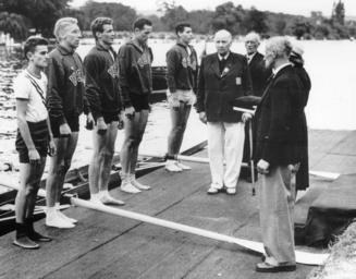 | Keywords: 1948 Olympics rowing 4 with.tif en 1948 Olympic Games gold medal award ceremony for rowing in the coxed fours event for men held on August 9 on the Thames in Henley Oxfordshire England UK Recipients left to right Allen Morgan Warren Westlund Robert Martin Robert Will and Gus Giovanelli It comes from Bob Martin's scrapbook my father http //www row2k com/features/features cfm action read ID 291 Bob Martin Jr 1948-08-09 My scan of my father's photo and originally published here - http //www row2k com/features/features cfm action read ID 291 1948 Summer Olympics rowers Rowing competitions University of Washington River Thames in Oxfordshire Henley-on-Thames 1948 in rowing Olympic Games medal ceremonies |