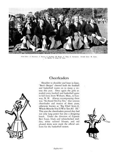 Keywords: sachem sachems logo winchester high school aberjona yearbook sachemsachemslogowinchesterhighschoolaberjonayearbook native american nativeamerican blackandwhite monochrome text black and white "Cheerleaders "...Always accompany [the cheerleaders] was No Stand-'Em-Up-'Em, that veteran mascot of three years, otherwise know as "Score-a-Whole-Mess-So-You'll-Win-'Em-All III." Drawing of a cheerleader carrying a pennant with a "W" with an animal mascot at her feet that has a feather and the letter "W" on its body. Another drawing of an animal mascot dressed as a cheerleader with headband, feather, and "W" pennant." Aberjona yearbook 1953, Native images from Winchester, MA "Cheerleaders "...Always accompany [the cheerleaders] was No Stand-'Em-Up-'Em, that veteran mascot of three years, otherwise know as "Score-a-Whole-Mess-So-You'll-Win-'Em-All III." Drawing of a cheerleader carrying a pennant with a "W" with an animal mascot at her feet that has a feather and the letter "W" on its body. Another drawing of an animal mascot dressed as a cheerleader with headband, feather, and "W" pennant." Aberjona yearbook 1953, Native images from Winchester, MA