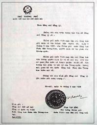 | Keywords: 1958 diplomatic note from phamvandong to zhouenlai.jpg In 1958 the People's Republic of China issued a declaration defining its territorial waters which encompassed the Spratly and Paracel Islands North Vietnam's prime minister Pham Van Dong sent a diplomatic note to Zhou Enlai stating that The Government of the Democratic Republic of Vietnam respects this decision The diplomatic note was written on September 14 and was publicized on Nhan Dan newspaper Vietnam on September 22 1958 The content of Pham Van Dong's diplomatic note to Premier Zhou Enlai is as follows Comrade Prime Minister We have the honour to bring to your knowledge that the Government of the DRVN recognizes and supports the declaration dated 4th September 1958 of the Government of the PRC fixing the width of the Chinese territorial waters The Government of the DRVN respects this decision and will give instructions to its State bodies to respect the 12-mile width of the territorial waters of China in all their relations in the maritime field with the PRC I address to you comrade Prime Minister the assurance of my distinguished consideration collected by www spratlys org http //www spratlys org/collection/claims/vietnam/vietnam1 htm 1958-09-14 Vietnam Government PD-VietnamGov PD-PRC-exempt http //www mevietnam org/lanhtho-lanhhai/feer-dispute html and http //www fmprc gov cn/mfa_chn/zyxw_602251/t1163255 shtml Spratly Islands Relations of China and Vietnam |