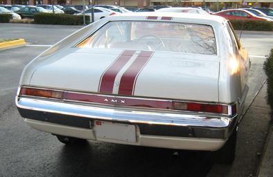 | Keywords: 1968 AMC AMX 390 GO PAC white r.jpg 1968 AMX by American Motors Corporation AMC two-seat sport coupe White with red stripes This car has the optional 390 Go Package that included the 390 cu in 6 4 L 315 hp 235 kW V8 engine racing stripes and other high-performance components The wheels and red stripe tires are correct for the year own 2008-12-13 CZmarlin ” Christopher Ziemnowicz releases all rights but a photo credit would be appreciated if this image is used anywhere other than Wikipedia Please leave a note at Wikipedia http //en wikipedia org/w/index php title User_talk CZmarlin action edit section new here Thank you thumb left Front view of this car thumb center Side view of this car AMC AMX White coupes |