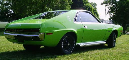 | Keywords: 1970 AMC AMX BBG-shadow R.JPG 1970 AMX by American Motors Corporation AMC two-seat sport coupe This muscle car is finished in Big Bad Green with optional shadow mask -- a satin black-painted hood and window surrounds offset by silver striping This car has the optional Trendsetters a functional side exhaust system Note the wheels do not have the the standard trim rings installed Own uploaded on 2009-06-08 CZmarlin ” Christopher Ziemnowicz releases all rights but a photo credit would be appreciated if this image is used anywhere other than Wikipedia Please leave a note at Wikipedia http //en wikipedia org/w/index php title User_talk CZmarlin action edit section new here Thank you Left side view of this AMC AMX 1970 AMC automobiles Green coupes |