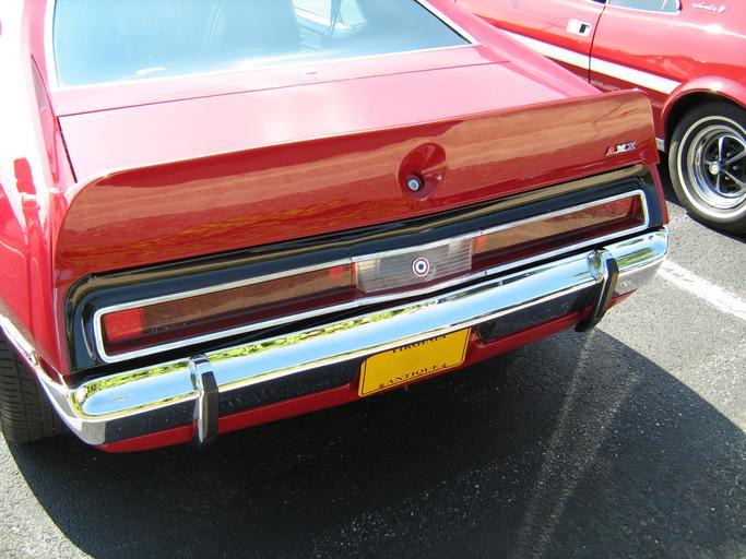 Keywords: 1971 AMC Javelin AMX red MD reartail.jpg en The standard equipment rear spoiler on the 1971 AMC Javelin AMX a high-performance two-door hardtop finished in red This top-of-the line muscle pony car came standard with American Motors' 360 cubic inch 5 9 L V8 engine Photograph taken at a show car show sponsored by the Potomac Ramblers Club own 2010-09-25 CZmarlin ” Christopher Ziemnowicz releases all rights but a photo credit would be appreciated if this image is used anywhere other than Wikipedia Please leave a note at Wikipedia http //en wikipedia org/w/index php title User_talk CZmarlin action edit section new here Thank you thumb left Front right side view thumb center Front left view thumb left Driver's side cockpit design thumb center Interior and front bucket seat design thumb left Rear view of this Javelin AMX thumb center Head on view and grille design thumb left Detail of AMC logo badge centered below the rear window thumb center Detail of AMX model badge on the C pillar panel thumb left The twin-cove indentations on the roof AMC Javelin AMX Automobile rear spoilers 1971 AMC automobiles |