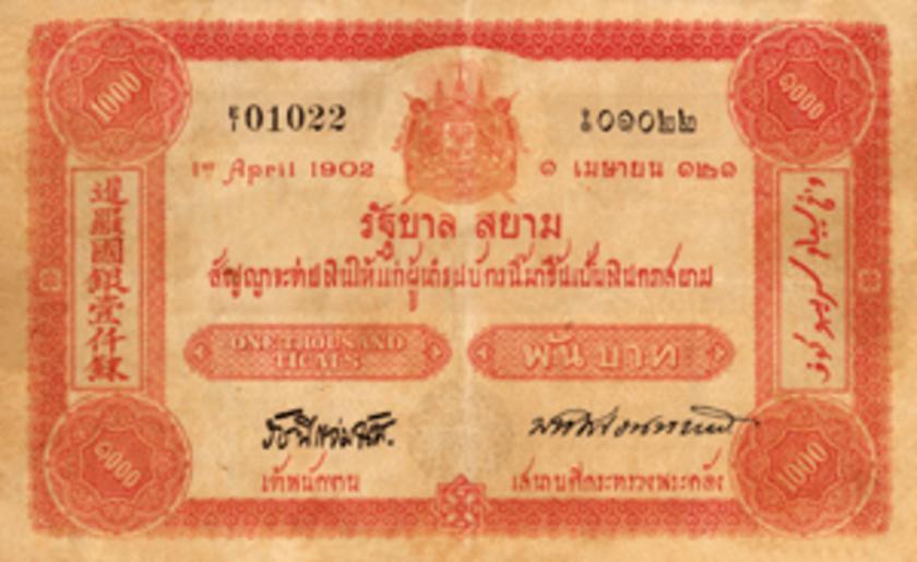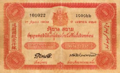| Keywords: 1.1000f.gif en Obverse side of the THB 1 000 banknote Series 1 - first come into circulation during the reign of King Rama V circa 1902 th ภาพด้านหน้าของธนบัตรราคา 1000 บาท แบบ 2 ออกใช้ในสมัยรัชกาลที่ 5 ราวปี พ ศ 2445 1902 https //www bot or th/Thai/Banknotes/HistoryAndSeriesOfBanknotes/Pages/Banknote_Series01 aspx Bank of Thailand other versions Custom license marker 2015 03 14 PD-Thailand Uploaded with UploadWizard Banknotes of Thailand Banknotes with a face value of 1000 | ||||