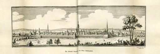 | Keywords: 11113439514 6508b4456e o „Die Altstadt Hannover im 16. Jahrhundert“ etwa von Westen gesehen (Linden) u.a. links mit Nikolaikapelle und Steintor, rechts inneres und äußeres Aegidientor und Marienkapelle.jpg Abdruck einer nur in Teilen einigermaßen realistischen Ansicht der Alt- Stadt Hannover von Osten her etwa vom Standort des ehemaligen Dorfes Linden das hier noch nicht einmal durch eine Wegeführung oder den Flussübergang über die Ihme angedeutet ist Schon die Untertitelung im 16 Jahrhundert dürfte falsch sein da die Befestigung der Calenberger Neustadt hier durch die Stadtmauer im Vordergrund angedeutet erst nach der Residenznahme Hannovers durch Herzog Georg von Calenberg 1636 begann mitten im Dreißigjährigen Krieg also im 17 Jahrhundert Immerhin ist links die Nikolaikapelle zu sehen rechts davon das äußere und innere Steintor Rechts auf der Ansicht ist das äußere und innere Aegidientor zu sehen noch weiter rechts die ehemalige Marienkapelle Die wiedergegebene Stich eines noch unidentifizierten Kupferstechers entstammt dem von dem Historiker August Jugler 1833-1888 herausgegebenen Buch Aus Hannovers Vorzeit Ein Beitrag zur deutschen Cultur-Geschichte Mit 23 photolithographischen Abbildungen etc und wurde ursprünglich 1876 von der Aubeldruck-Anstalt Aubel Kaiser Lindenhöhe 38 b bei Cöln gedruckt Das hier zu sehende Digitalisat wurde im Rahmen einer umfangreicheren Aktion der British Library auf der Plattform Flickr hochgeladen anstatt direkt hier bei Commons von dort in höchstmöglicher Größe heruntergeladen dann mit einem Foto-Bearbeitungsprogramm per Autokontrast abgedunkelt und endlich hier hochgeladen Der Begleittext aus dem Buch fehlt noch - und enthält möglicherweise den Hinweis auf den ursprünglichen Urheber http //www flickr com/photos/britishlibrary/tags/sysnum001910891 ~ 1650 noch unidentizierter Kupferstecher PD-old Aus Hannovers Vorzeit Ein Beitrag zur deutschen Cultur-Geschichte Mit 23 photolithographischen Abbildungen etc von August Jugler Old maps of Hannover |