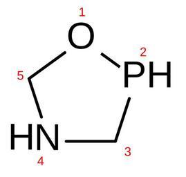 Keywords: 1,4,2-Oxazaphospholidin.svg en Structure of 1 4 2-Oxazaphospholidin with numbers de Strukturformel von 1 4 2-Oxazaphospholidin durchnummeriert own Orci 2008-10-16 Heterocyclic compounds with 1 ring