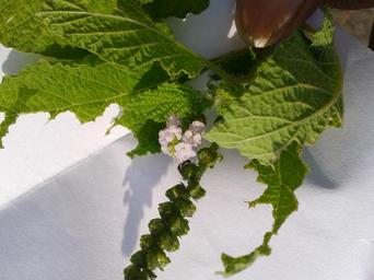 | Keywords: தேள் கொடுக்கு1.jpg en Botanical name - Heliotropium indicum Common name s - Indian heliotrope ; Scorpion weed Tamil name THELKOTUKKU scorpion sting Nativity India Root is a traditional medicine for cough ; Root extract induces sex hormone ;Leaf-tea cures measles ;Plant has anti cancer and anti tumour activities ;Tribal people use this plant for scorpion bites;Leaf juice is a medicine for Conjunctivity In photo - Insect eaten leaves of Heliotropium indicum ta தேள் கொடுக்கு களைச் செடியாகக் கருதப்பட்டாலும் நல்ல மூலிகை இது ; செடியைப்பார்த்தாலே ஏன் தேள்கொடுக்கு என்ற பெயர் வந்தது என்பது விளங்கும் வேர்க்கசாயம் பாலுர்ணவுச் சுரப்பிகளை ஊக்குவிக்கும் ; புற்றுநோய் த ர்க்கும் குணம் இச் செடிக்கு உண்டு ;இலையிலிருந்து தயாரிக்கப்படும் ட மணல்வாரி அம்மைக்கு மருந்தாகும்; இலைச் சாறு கண்நோய் மருந்து; தேள்கடி மருந்தாக இம் மூலிகையை ஆதிவாசிகள் பயன்படுத்துகிறார்கள் படம் - பூச்சி தின்ற தேள்கொடுக்குச் செடி இலைகள் hi हथसुरा Hathsura ml തേക്കട Thakkeda own Dr S Soundarapandian 2014-02-16 Own field work Shot in Chennai Tamilnadu India 4 5 kms off sea-shore ; Latitude-13°02'20 N ; Longitude- 80°13'43 E ; Elevation from sea level - 6 7 m Heliotropium indicum Cc-zero |