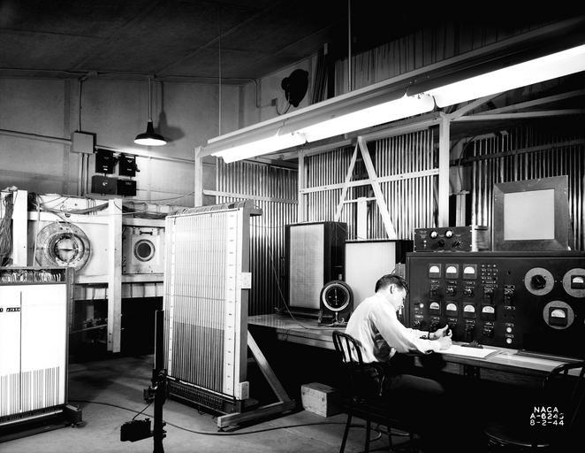 | Keywords: blackandwhite monochrome indoor black and white (A-6245): This view of the 1 x 3.5-Foot High-Speed Tunnel’s test chamber shows its test section (L background), controls (R), and portable multi-tube manometer panels with a camera stand in the foreground. (A-6245): This view of the 1 x 3.5-Foot High-Speed Tunnel’s test chamber shows its test section (L background), controls (R), and portable multi-tube manometer panels with a camera stand in the foreground. | ||||