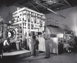 | Keywords: blackandwhite black and white (A-13011): This view of the 1- x 3-Foot Supersonic Tunnel No. 2 shows the entire tunnel except its diffuser and exhaust, which are out of the photo to the left. The flexible-wall nozzle dominates this scene, with the test section to its left, and the settling chamber behind the control console to its right. . (A-13011): This view of the 1- x 3-Foot Supersonic Tunnel No. 2 shows the entire tunnel except its diffuser and exhaust, which are out of the photo to the left. The flexible-wall nozzle dominates this scene, with the test section to its left, and the settling chamber behind the control console to its right. . |