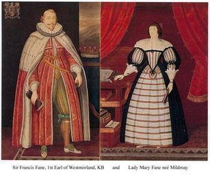 | Keywords: Francis Fane, 1st Earl of Westmorland, KB (February 1580 - 23 March 1629), of Mereworth in Kent, and then of Apethorpe in Northamptonshire, was first a Member of Parliament and then an English peer. Fane was the first surviving son and heir of Sir Thomas Fane (died 1589), of Badsell in Kent, by his second wife, the former Mary Neville (c. 1554-1626), sole daughter and heiress of the 6th (and de jure 4th) Baron Bergavenny (died 1587), by his wife, the former Lady Frances Manners, daughter of the 1st Earl of Rutland. The Barony of le Despenser was called out of abeyance in 1604 in favour of Fane's mother, Mary, Lady Fane, and she accordingly became 7th Baroness le Despenser. She was also, by modern doctrine, 7th and 5th Baroness Bergavenny, having inherited the senior two Baronies of Bergavenny from her father on his death. Fane's grandfather George Fane, of Badsell in Tudeley, was Sheriff of Kent 1557-58, married Joan, daughter of William Waller of Groombridge in 1557, and died in 1571. Fane was educated at Maidstone Grammar School and matriculated at Queens' College, Cambridge (c. 1595).[1] He was admitted to Lincoln's Inn 19 November 1597. He was created a Knight of the Bath at the Coronation of King James I on 25 July 1603. With the support of Lord Cobham he was returned as a Knight of the Shire (Member of Parliament) for Kent in 1601. After Cobham's disgrace Fane was returned for the borough seat of Maidstone in 1604, 1614 and 1621, and then that of Peterborough in 1624. On 29 December 1624, he was created Baron of Burghersh, in the County of Sussex, and Earl of Westmorland (1008th on the roll). On his mother's death on 28 June 1626 he succeeded her as 8th Baron le Despenser, and as de jure 8th and 6th Baron Bergavenny. On 15 February 1598/99 Fane married Mary Mildmay (d. 9 April 1640), daughter and eventually sole heir of sometime Ambassador to Paris Sir Anthony Mildmay (d. 1617), of Apethorpe Hall, Northamptonshire, by his wife Grace (1552-1620) daughter and co-heir of Sir Henry Sherington (Sharington) (c. 1518-1581) of Lacock Abbey, Wiltshire. (Grace Mildmay's sister Olive (d. 1646) who inherited Lacock abbey, married a Talbot, from which eight generations later sprang the pioneer photographer William Fox Talbot (d. 1877)). Sir Anthony Mildmay's father Sir Walter Mildmay (c. 1520-1589), PC, MP, bought Apethorpe in 1550; was Chancellor of the Exchequor 1559-89; and founded Emmanuel College, Cambridge 1583. Apethorpe was sold by the 13th Earl of Westmorland to Lord Brassey in 1904. Lord Westmorland was buried at Apethorpe on 17 April 1629. A monumental inscription is at Mereworth church near Badsell. He left his widow (Mary Mildmay), who died at Stevenage and was buried at Apethorpe, and many children...amongst them: * Mildmay Fane, the second Earl, poet and a Member of Parliament. * Colonel the hon. George Fane, Member of Parliament. Francis Fane, 1st Earl of Westmorland, KB (February 1580 - 23 March 1629), of Mereworth in Kent, and then of Apethorpe in Northamptonshire, was first a Member of Parliament and then an English peer. Fane was the first surviving son and heir of Sir Thomas Fane (died 1589), of Badsell in Kent, by his second wife, the former Mary Neville (c. 1554-1626), sole daughter and heiress of the 6th (and de jure 4th) Baron Bergavenny (died 1587), by his wife, the former Lady Frances Manners, daughter of the 1st Earl of Rutland. The Barony of le Despenser was called out of abeyance in 1604 in favour of Fane's mother, Mary, Lady Fane, and she accordingly became 7th Baroness le Despenser. She was also, by modern doctrine, 7th and 5th Baroness Bergavenny, having inherited the senior two Baronies of Bergavenny from her father on his death. Fane's grandfather George Fane, of Badsell in Tudeley, was Sheriff of Kent 1557-58, married Joan, daughter of William Waller of Groombridge in 1557, and died in 1571. Fane was educated at Maidstone Grammar School and matriculated at Queens' College, Cambridge (c. 1595).[1] He was admitted to Lincoln's Inn 19 November 1597. He was created a Knight of the Bath at the Coronation of King James I on 25 July 1603. With the support of Lord Cobham he was returned as a Knight of the Shire (Member of Parliament) for Kent in 1601. After Cobham's disgrace Fane was returned for the borough seat of Maidstone in 1604, 1614 and 1621, and then that of Peterborough in 1624. On 29 December 1624, he was created Baron of Burghersh, in the County of Sussex, and Earl of Westmorland (1008th on the roll). On his mother's death on 28 June 1626 he succeeded her as 8th Baron le Despenser, and as de jure 8th and 6th Baron Bergavenny. On 15 February 1598/99 Fane married Mary Mildmay (d. 9 April 1640), daughter and eventually sole heir of sometime Ambassador to Paris Sir Anthony Mildmay (d. 1617), of Apethorpe Hall, Northamptonshire, by his wife Grace (1552-1620) daughter and co-heir of Sir Henry Sherington (Sharington) (c. 1518-1581) of Lacock Abbey, Wiltshire. (Grace Mildmay's sister Olive (d. 1646) who inherited Lacock abbey, married a Talbot, from which eight generations later sprang the pioneer photographer William Fox Talbot (d. 1877)). Sir Anthony Mildmay's father Sir Walter Mildmay (c. 1520-1589), PC, MP, bought Apethorpe in 1550; was Chancellor of the Exchequor 1559-89; and founded Emmanuel College, Cambridge 1583. Apethorpe was sold by the 13th Earl of Westmorland to Lord Brassey in 1904. Lord Westmorland was buried at Apethorpe on 17 April 1629. A monumental inscription is at Mereworth church near Badsell. He left his widow (Mary Mildmay), who died at Stevenage and was buried at Apethorpe, and many children...amongst them: * Mildmay Fane, the second Earl, poet and a Member of Parliament. * Colonel the hon. George Fane, Member of Parliament. 1stEarlOfWestmorlandAndWife.jpg Artwork Creator unknown Portrait of Francis Fane 1st Earl of Westmorland c 1580-c 1629 and his wife Mary century 17 oil Institution unknown http //www noursefamily net/wills/